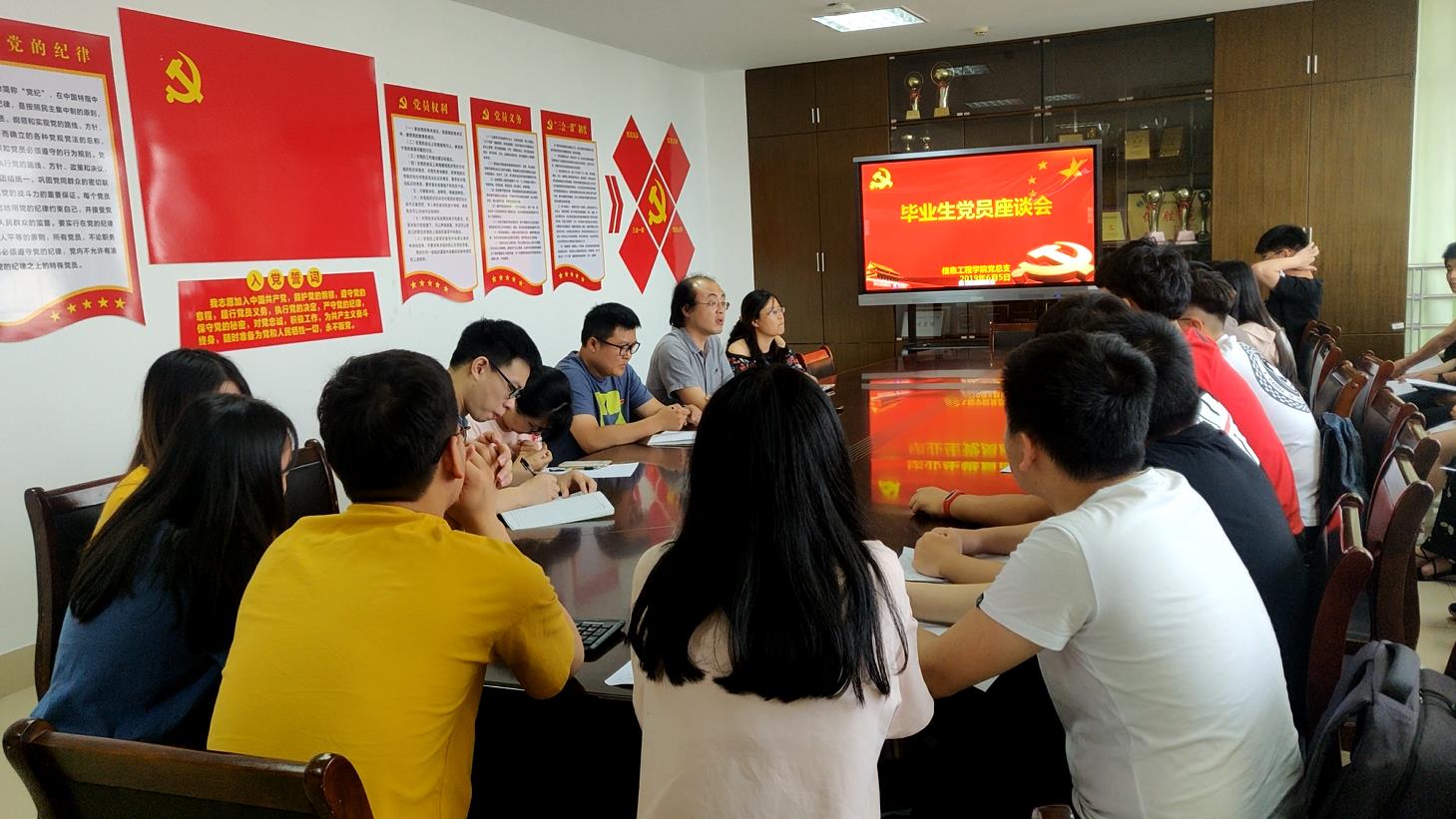6月5日上午,信息工程学院隆重举行新党员宣誓仪式及毕业生党员座谈会,党总支书记叶俊,学工办主任谷明慧,党支部书记及37名学生党员和预备党员参加宣誓仪式。会议由邹琪帆同学主持。