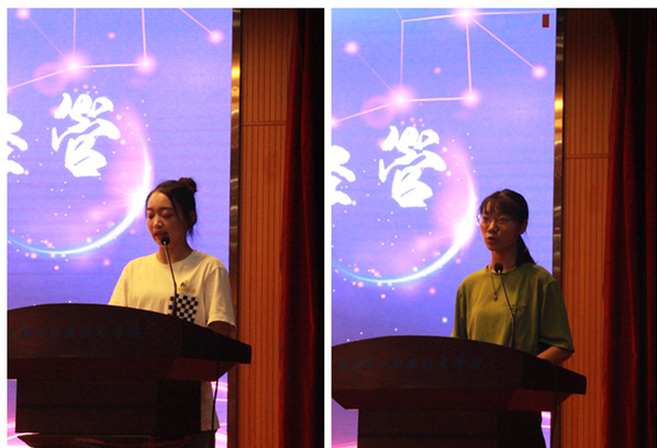 17连锁1班赵伊露作为老生代表,分享了自己在衢职经管的成长历程,勉励学弟学妹们开拓进取在实践中成长,专注学习不虚度光阴,培养科学习惯,用心经营好自己的人生。新生代表19会计1班郭丽萍发言,承诺将在大学生活中,严守校规校纪,刻苦学习、博采众长,以勤为径,以苦作舟,努力让梦想照进现实。
