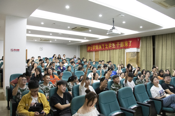 大学生自我发展中心的四位学生干部现身说法,结合自己在校期间承担各项学生活动的组织工作的真实经验,分享了自己的感受,和2019级新生们进行了亲密的互动。其中现任的二幢楼层长虞同学还别出心裁地在现场再现了“走寝”,他说这是我每天都在做的工作,希望能通过再现,让新生们感受楼层长工作,吸引真正喜欢公寓服务工作的新生加入团队。活动现场气氛热烈,新老两代交流顺畅,为新生们解决了很多学生干部任职方面的疑惑。