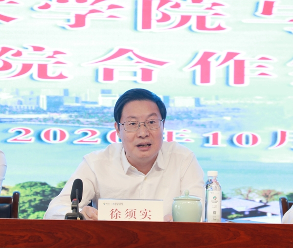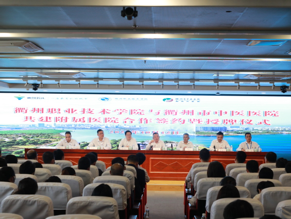 我校党委书记徐须实致辞。他代表衢职院衷心感谢一直以来关心和支持学校发展的市政府、市卫健委、市中医院及各相关单位、社会各界。他指出,我校作为衢州市唯一一所办有医药类专业的高等院校,有70年的办学积淀,基础最好,师资最优,规模最大,承担着为衢州及周边地区培养医护大健康人才的重要使命。但由于受到各种办学条件的限制,影响了我校医学院申报省高水平专业群建设计划的竞争力,也错失了为基层输送最急需的临床医生、全科医生的机会。目前,经多方调研和论证,我校准备将国家级非物质文化遗产“杨继洲针灸”传承与保护单位——衢州中医院作为校非直属的附属医院,通过开设国控的针灸推拿专业,优化专业结构,构建医养健康专业群,为争取列入我省高水平专业群建设计划增加竞争力,为地方培养以针灸推拿技术见长的中医类、医养健康类人才,满足基层和医养机构急切的人才需求,同时也为学校以后申办临床医学专业奠定基础。他希望,签约后,两个单位做好资源融通,做好团队融合,做好优势互补。真正让医教协同、产教融合成为加快医学教育创新发展的主要路径。