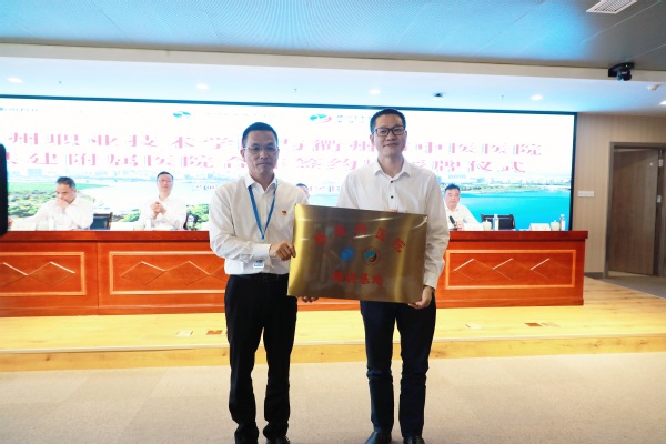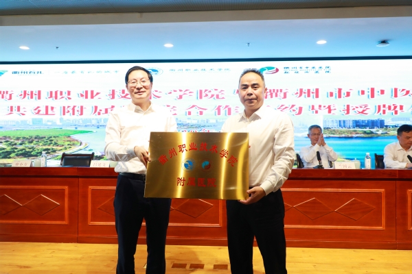 徐须实向市中医医院授“衢州职业技术学院附属医院”牌,中医医院院长廖小方接牌;市中医医院党委书记陈伟向我校医学院授“杨继洲医院培训基地”牌,我校医学院院长姚水洪接牌。