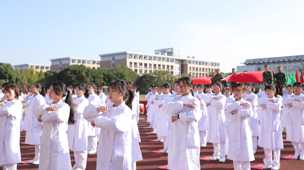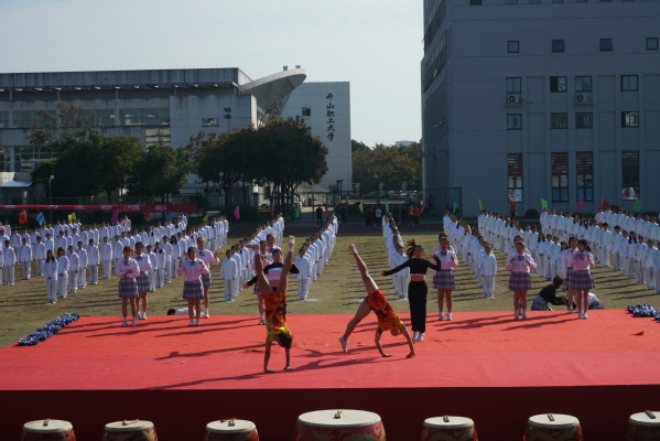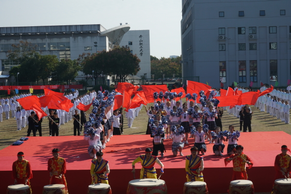 休闲体育专业的同学为大家带来旗鼓表演。红旗飘飘、战鼓雷鸣;由六个二级学院的400名2019级同学共同表演的节目是健身气功——八段锦,整齐划一,修身养性;校健美操舞姿曼妙,他们跃动的步伐洋溢着青春的活力,脸上欢快的笑容充满着自信,带动了会场的欢腾。