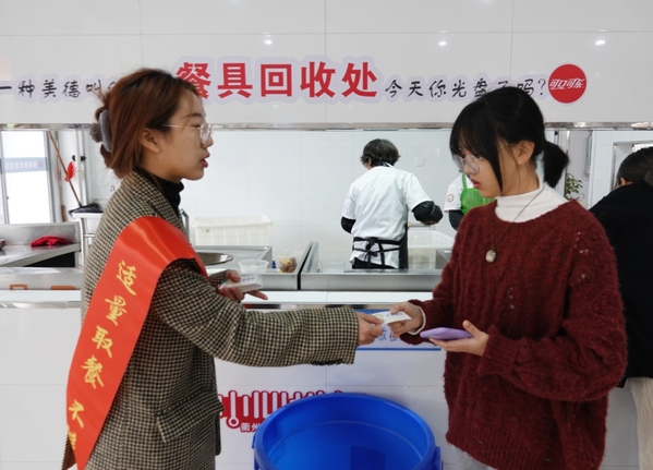 光盘有礼,节约有我。“同学你好,我们现在倡导光盘行动,吃完所有的饭菜,可以奖励光盘券一张,凭光盘券可前往食堂出口处领取水果一份哦!”“老师您好,欢迎加入光盘一族,光盘可以领取水果一份哦!”这几天,食堂里的学生志愿者们都会热情地向光盘成功的师生递上一张光盘券,并向大家宣传浪费可耻、节约为荣、倡导光盘的节粮知识。五天来,共发放光盘券3000余张,赠送水果3000余份,师生节约意识有所提升,餐厨垃圾明显减少。