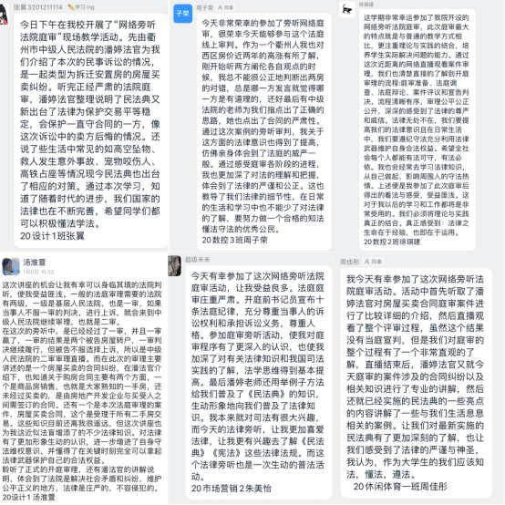 直播结束之后,潘法官对庭审中的重点和难点进行了专业的分析,让师生对于直播中的案件有更加科学、更加全面的理解和把握。潘法官就已经实行的《民法典》亮点以及和师生相关的案例知识,进行多角度、高视野、接地气、易理解的介绍。