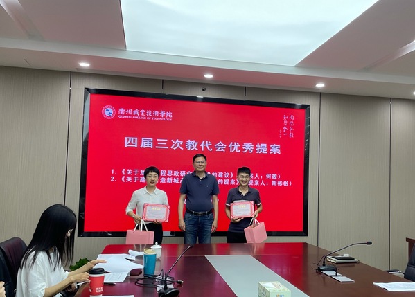 四届三次教代会共收到代表提案15件。其中,由何敬同志提出的《加强课程思政研究和建设》、斯彬彬同志提出的《建立智造新城产教融合平台》共2件提案立为重点提案,同时也被评为四届三次教代会优秀提案。王东升为他们颁发了荣誉证书。