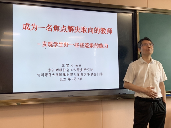 沈教授以“成为一名焦点解决取向的教师——发现学生好一些些迹象的能力”为主题,通过知识讲授、案例分析、分组练习、现场演练等方式,讲授了焦点解决技术的基本理念、工作流程和核心技术。焦点解决技术以目标为导向,以解决问题之道为焦点,从过去的人生经历中挖掘解决问题的方法,培养当事人成为他生命的专家。