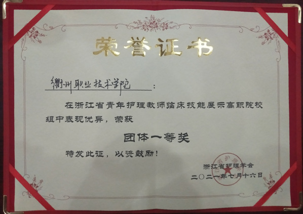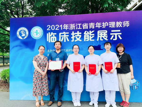 7月16日,2021年浙江省青年护理教师临床技能展示大赛暨2021年全国青年护理教师临床护理技能竞赛浙江地区选拔赛在湖州师范学院隆重举行。我校护理专任教师刘瑞芳,覃琴和我校兼职教师衢州市人民医院呼吸内科护士长郑彩霞组队参赛。经过激烈的角逐,斩获个人一等奖2项、二等奖1项、高职组团体一等奖。