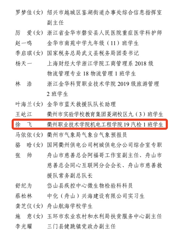 近日,共青团浙江省委通报表扬2021年“浙江省共青团和青年工作成绩突出集体和个人”,我校机电工程学院19级学生徐飞获评“成绩突出共青团员”。