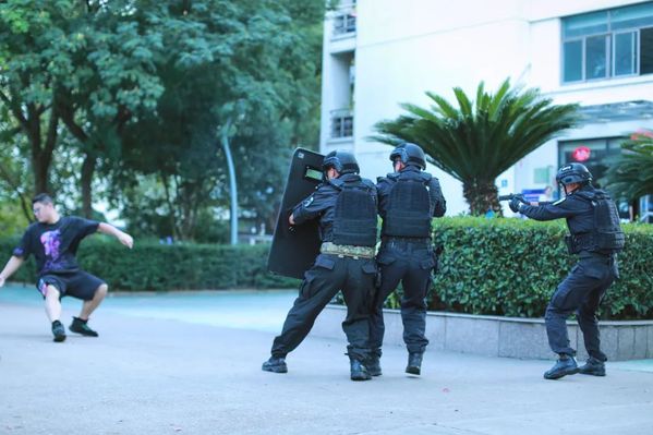 首先进行的是反恐演练,嫌疑人携带管理刀具出现在三号楼西门时被治安巡逻队员发现,值班室接到报警后,立即通知保卫人员赶赴现场处置,对犯罪嫌疑人进行控制,随后向后勤保卫处负责人和学校反恐防暴工作领导小组报告情况,启动反恐防恐工作预案,同时报告公安部门,后勤保卫处立即对现场进行警戒,控制嫌疑人,并将嫌疑人交由公安特警处置。