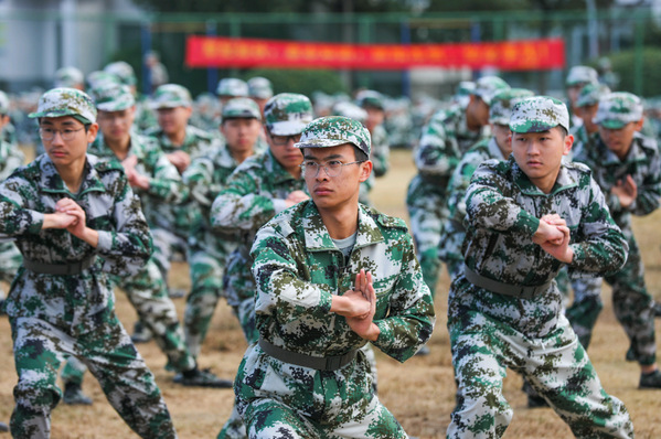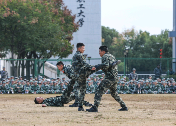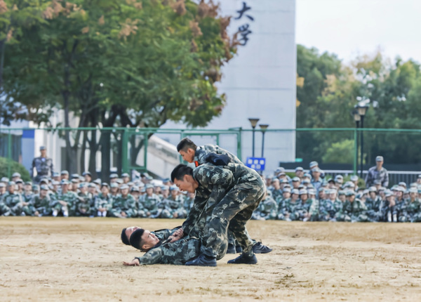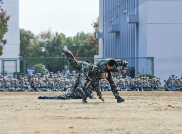 承训教官为全体新生表演了擒拿格斗术,迅疾的动作尽展飒爽英姿,每一个动作都整齐划一,每一声喊杀都气势磅礴,精彩的表演赢得了现场观众的阵阵掌声和欢呼声。