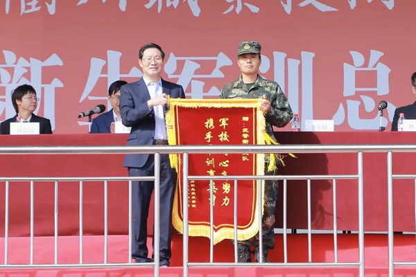 党委书记徐须实向承训部队——武警衢州支队赠送了锦旗,感谢他们对我校军训工作的大力支持与帮助。