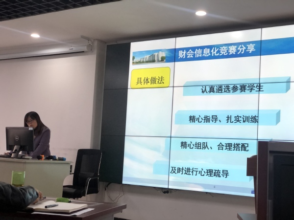 活动中,连锁经营管理专业陶莉莉老师、会计专业王晓辉老师和经济管理学院党总支副书记蒋雪芬老师进行了专题分享。陶莉莉老师结合自己指导学生参加第七届中国国际“互联网+”大学生创新创业大赛并荣获职教赛道国赛银奖的经历,进行了比赛规则解读、项目选拔和培育及作品的撰写技巧等方面的分享。王晓辉老师在介绍财会信息化竞赛背景的基础上,重点讲解了具体的指导方法:认真遴选、精心指导、扎实训练,合理组队、及时进行心理疏导。蒋雪芬老师根据自己历年来指导学生参加职业生涯规划比赛的经验、大赛走向研读、优秀的获奖作品等方面进行了主题分享。