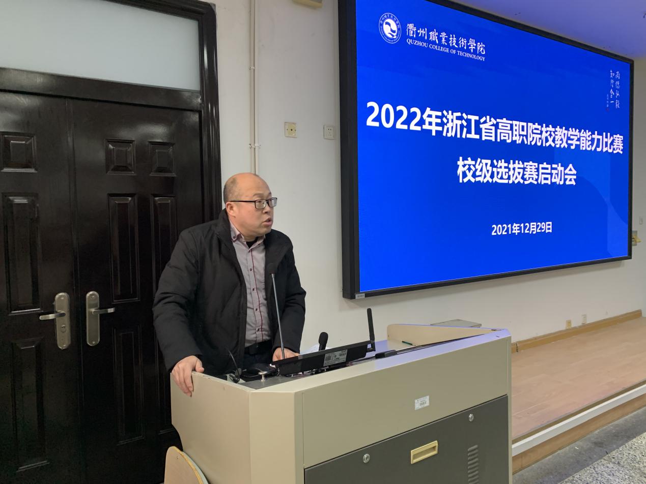 12月29日,我校在阶西2-1召开2022年浙江省高职院校教学能力比赛校级选拔赛启动会,二级学院(部)教学副院长(副主任)、拟参加2022年省赛教师团队及教务处相关人员参加会议,教务处王建处长主持会议。