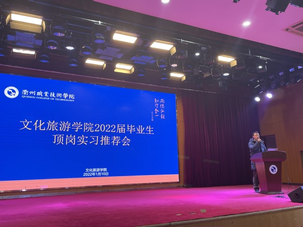 1月10日上午,文化旅游学院在图书馆1号报告厅举行2022年休闲体育专业毕业生顶岗实习动员大会暨企业宣讲会。文化旅游学院副院长黄志国、休闲体育专业主任王俊舰、学工办主任邵翔、休闲体育部分专任教师以及全体学生参加。