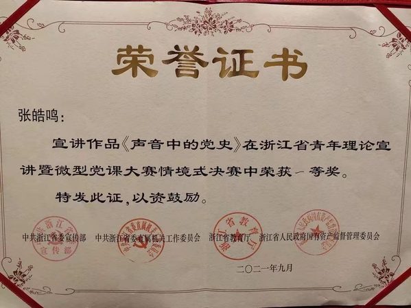 2021年,我院教师在各类竞赛中竞赛喜获佳绩。学院组建三支教学能力比赛团队参加校赛,三支团队均在校赛中获奖,其中一支队伍代表学校参加浙江省教学能力比赛获三等奖。学院教师卢晓燕老师撰写的课程思政案例获省课程思政优秀教学案例一等奖,微课作品获入选省课程思政优秀教学微课。张皓鸣老师获浙江省青年理论微党课大赛情景式决赛一等奖。