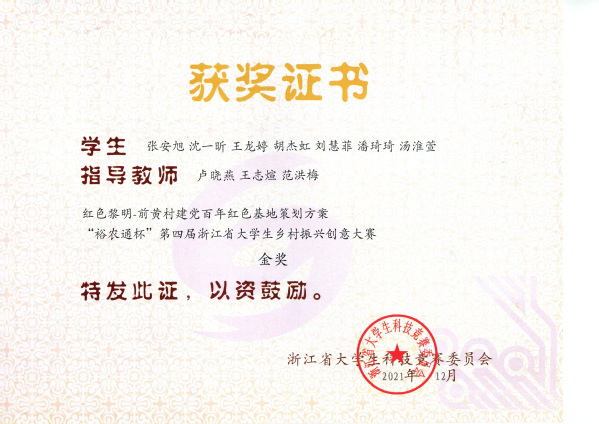 我院党员教师组织团队进驻乡村开展乡村振兴项目,项目成果获浙江省第四届大学生乡村振兴创意设计大赛金奖三项、银奖两项、铜奖一项,其中卢晓燕老师的团队项目《红色黎明-前黄村建党百年红色基地建设方案》入选高等美术教育学会2021年全国艺术设计产教融合成果系列展。