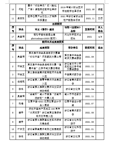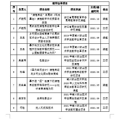 截至12月,艺术设计学院教师获得教学类比赛6项,出版教材1部,全年立项教学改革类项目5项,结题教学改革类项目等5项,温百秋老师的项目立项浙江省职业院校产教融合项目(省部级),教师艺术创作成果11项等。