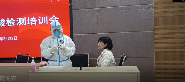 在核酸采样培训会上,衢州市中医医院护士长韩松花团队通过现场演示防护服等各防护用品穿戴、脱卸全流程及细致的讲解,指导全体在座教职工熟悉掌握全套防护装备规范、有序的穿脱方法。衢州市中医医院护理团队还通过实地操作鼻拭子和口咽拭子采样,使在座教职工更为直观地学习核酸检测采样的技术要领和注意事项。(后勤保卫处、医学院)