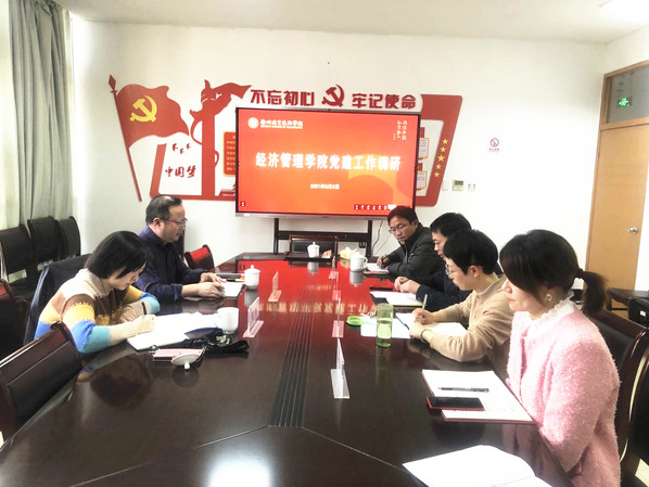3月3日下午,周帅一行到经济管理学院走访调研党建工作。经济管理学院领导班子成员参加会议。经济管理学院院长汪榜江就专业情况、教职工队伍建设及2022年重点工作进行汇报。党总支书记斯彬彬就党员队伍建设、近年来经济管理学院党总支在“党建+业务”方面的探索和本年度党建工作重点进行汇报。副院长覃龙飞和副书记蒋雪芬分别就师生技能竞赛指导、留衢顶岗与学生工作体系提炼、辅导员队伍建设及创新创业大赛事等分管工作进行汇报。周帅充分肯定了经济管理学院取得的工作成绩和本年度工作计划,认为其有特色、有章法、有基础,勉励其继续深入探索党建抓手,进一步提炼党建品牌,就如何解决现存问题与班子成员进行了探讨,并提出了解决思路。
