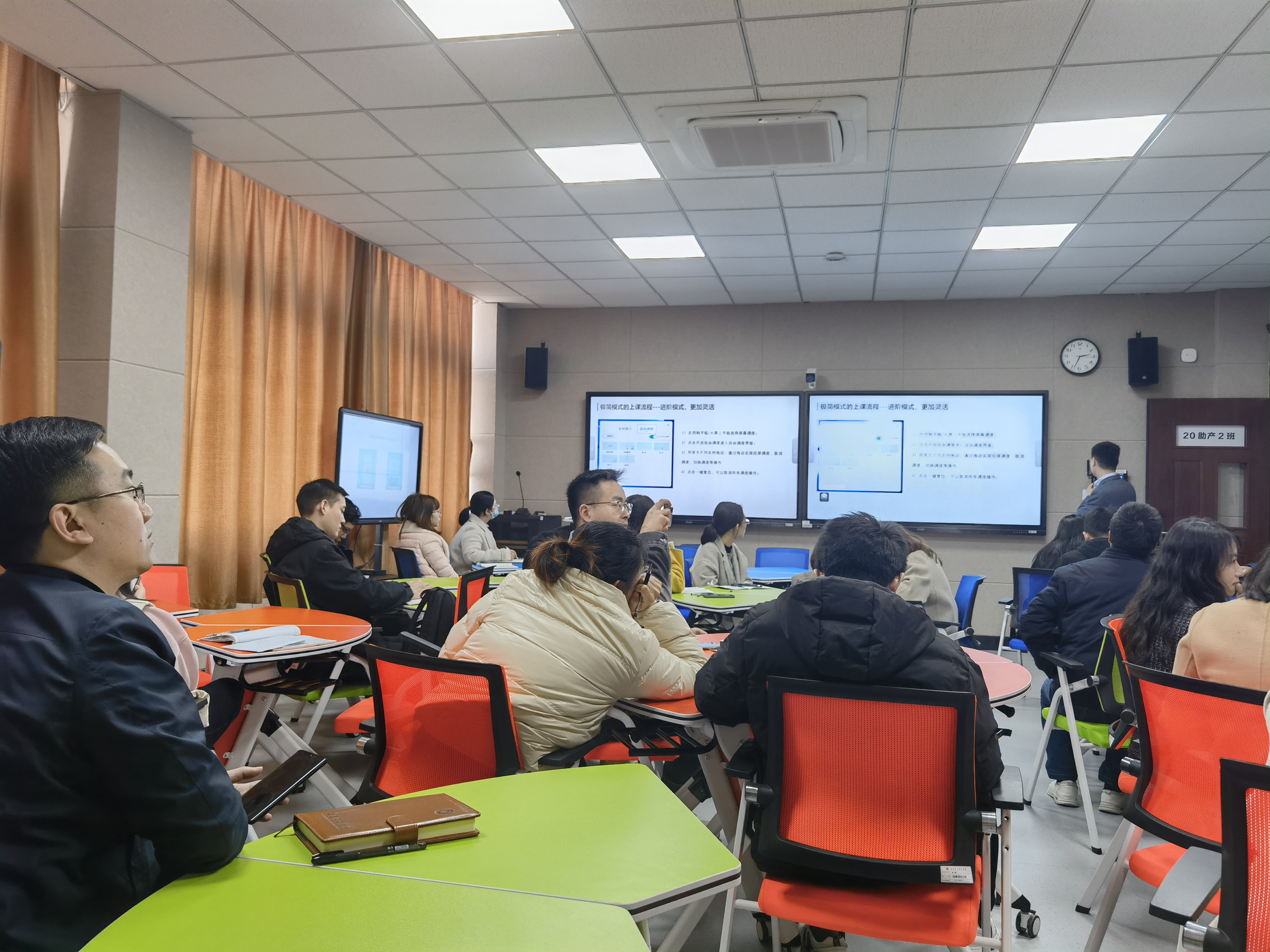 培训老师分别介绍了智慧教室设备设施的使用操作方法及使用技巧,包括智能控制中心、交互式智能平板、物联网控制系统等内容。在培训过程中教师积极参与互动,演练多屏协作、无线投屏、师生互动等功能的使用技巧。