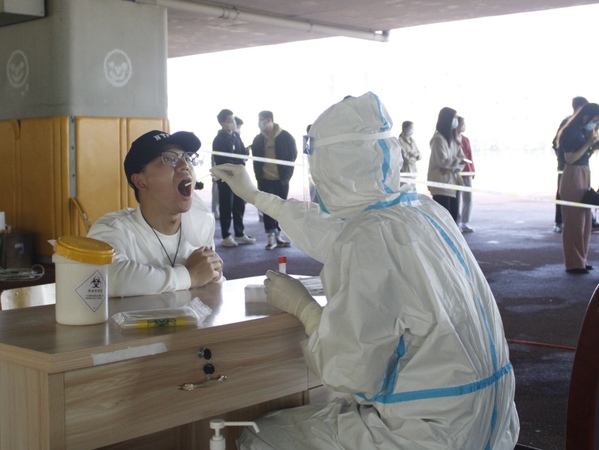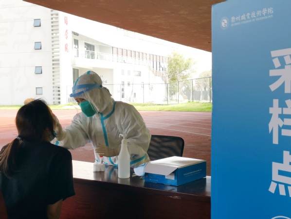 学生们正在有条不紊地进行核酸检测。
