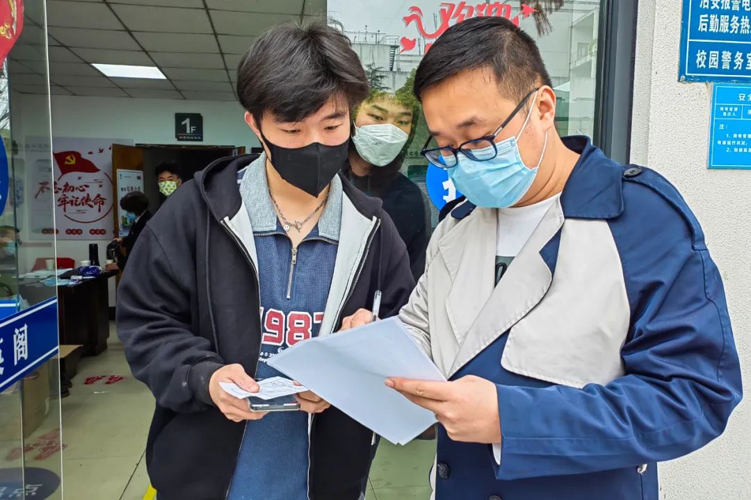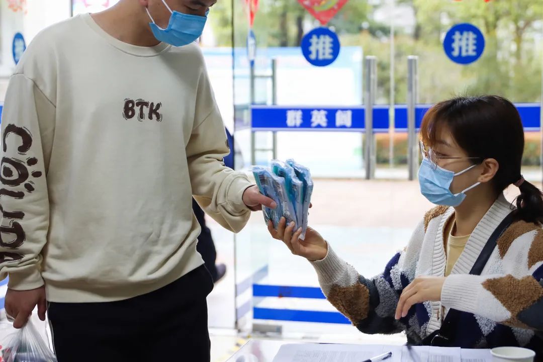 寝室解封后,方焕云为同学们递上医用口罩。提醒大家疫情未散,仍要戴好口罩,做好防护。