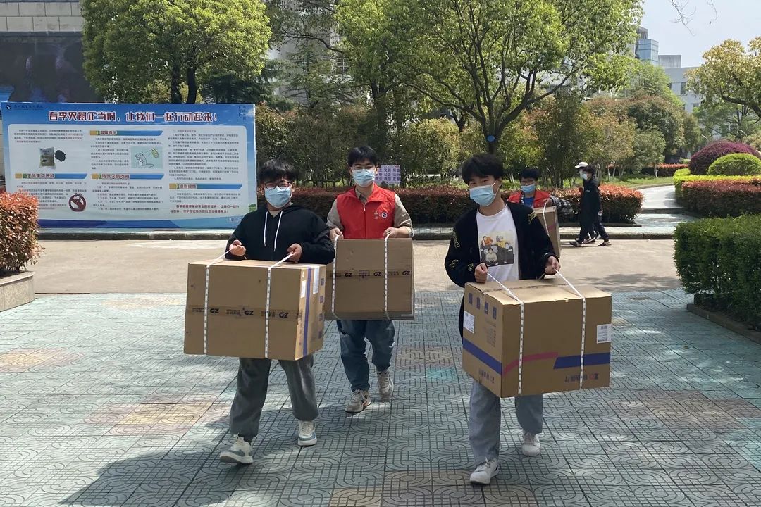 志愿者们搬来了信息工程学院为寝室解封后同学们日常用的医用口罩。
