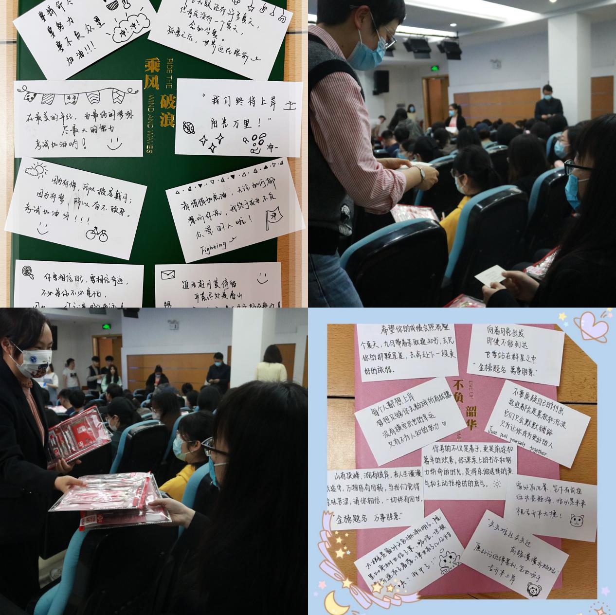 会后,全体老师给同学们赠送了考试文具、口罩和祝福卡片。
