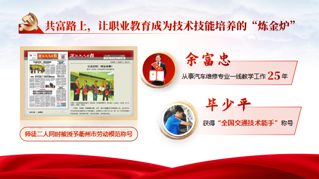 《浙江工人日报》头版头条曾报道了“师徒双双成劳模”的事迹,他们就是我校余富忠和毕少平师徒。师傅余富忠从事汽车维修专业一线教学工作25年,衢州一半以上的汽车修理工都接受过他的培训。徒弟毕少平勤奋好学,曾获得全国交通技术能手。2019年,师徒二人同时被授予衢州市劳动模范称号。