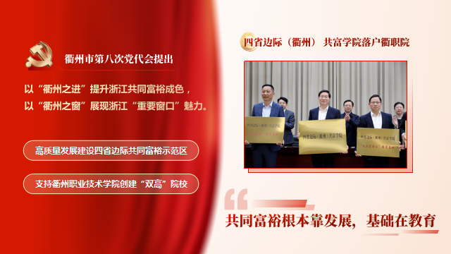市第八次党代会提出,要以“衢州之进”提升浙江共同富裕成色,以“衢州之窗”展现浙江“重要窗口”魅力。大会精心描绘了今后五年发展的宏伟蓝图,发出了“牢记殷殷嘱托、加快追赶跨越,高质量发展建设四省边际共同富裕示范区”的冲锋号角,明确提出支持衢职院“双高”院校建设,让全体师生责任满满、动力满满。不久前召开的市委农村工作会议上,市委高屹书记又亲自将四省边际(衢州)共同富裕学院授予我校,对在共同富裕示区建设中进一步发挥衢职院作用寄予厚望。共同富裕根本靠发展,基础在教育。作为与经济发展和就业联系最为紧密的教育类型,职业教育在“共同富裕示范区”建设中的作用越来越凸显。共富路上,每一位职教青年都在努力奔跑、勇敢践行。