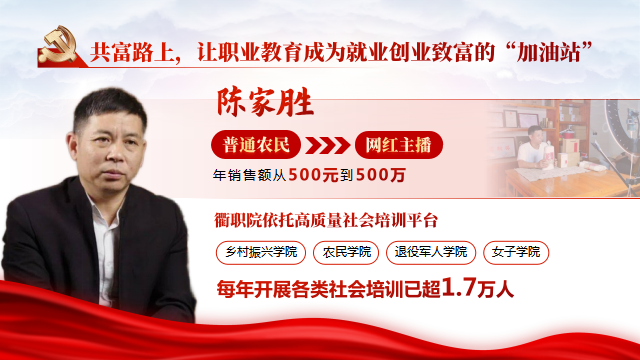 沟溪乡德门龙手工面坊第四代传人陈家胜参加衢职院开展的村播培训后,从“普通农民”成长为一名“网红主播”,实现了年销售额500元到500万的飞跃。近年来,衢职院依托乡村振兴学院、农民学院、退役军人学院、女子学院等高质量社会培训平台,每年开展各类社会培训已超1.7万人,“衢州月嫂”等具有鲜明标识的培训品牌不断打响擦亮。