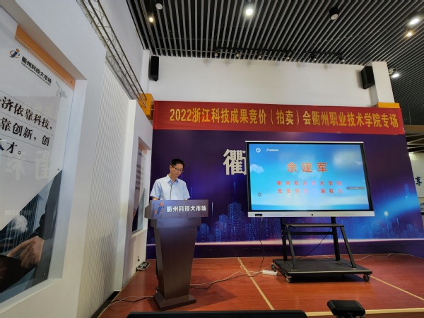 6月6日下午,2022浙江省科技成果竞价(拍卖)会衢州职业技术学院专场在258科技大市场隆重举行,校党委委员、副校长余建军,市科技信息研究院院长张利东出席,科研合作处全体成员及教师代表参加。 余建军向各位嘉宾介绍了我校以服务地方发展为宗旨的“六个一批”专项行动以及所取得的一系列成果,希望本次活动能够搭建起良好平台,更好地推进科技成果转化服务。他表示,今天恰逢农历芒种这个播种的日子,我校同企业界的各位朋友一起埋下衢职院科技成果的种子,期待明天一起收获累累的硕果。