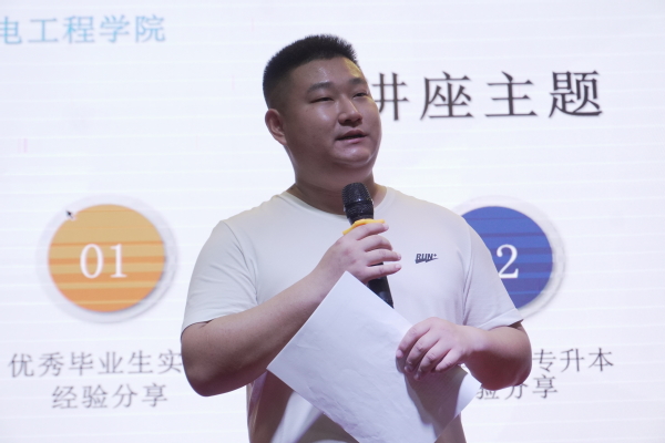讲座伊始,省级优秀毕业生徐飞为同学们详细介绍了自己在校学习、生活经历和在企业的实习经历,他建议学弟学妹们在大学期间要明确目标,学好专业知识,保持积极心态,做好职前准备。