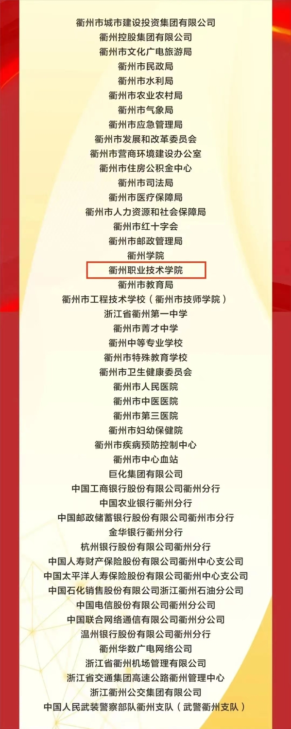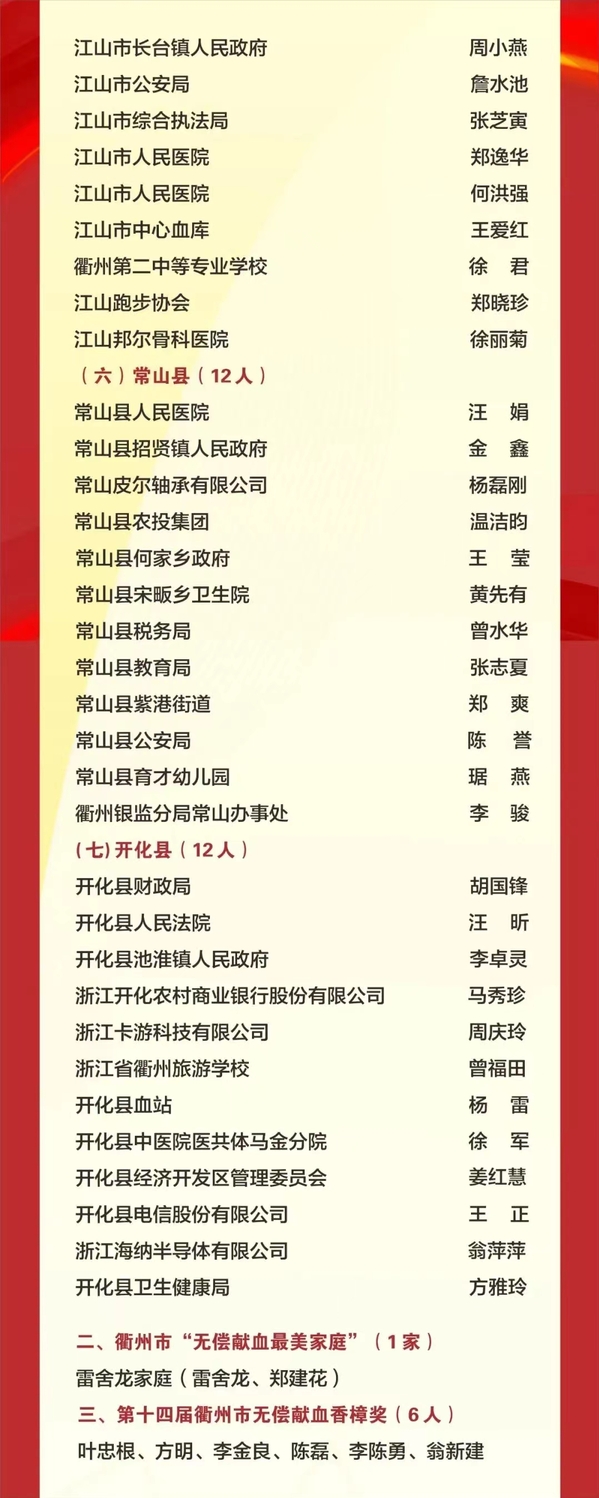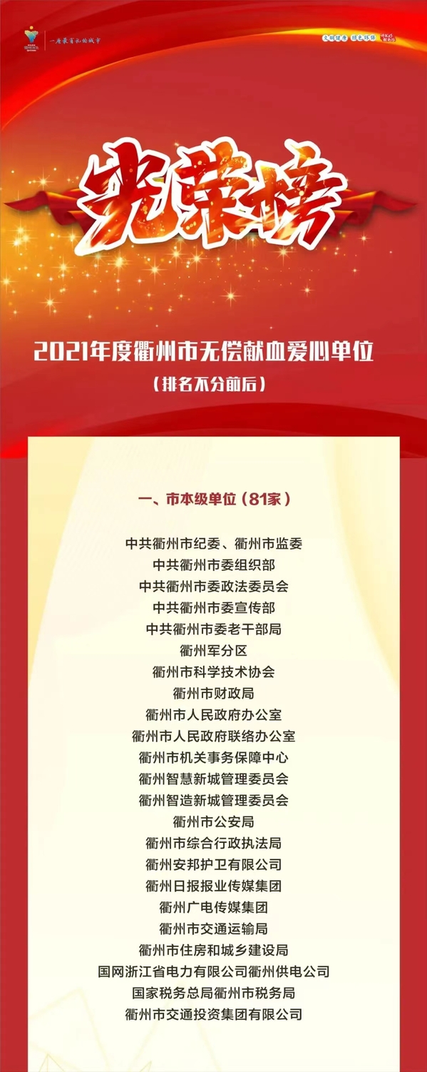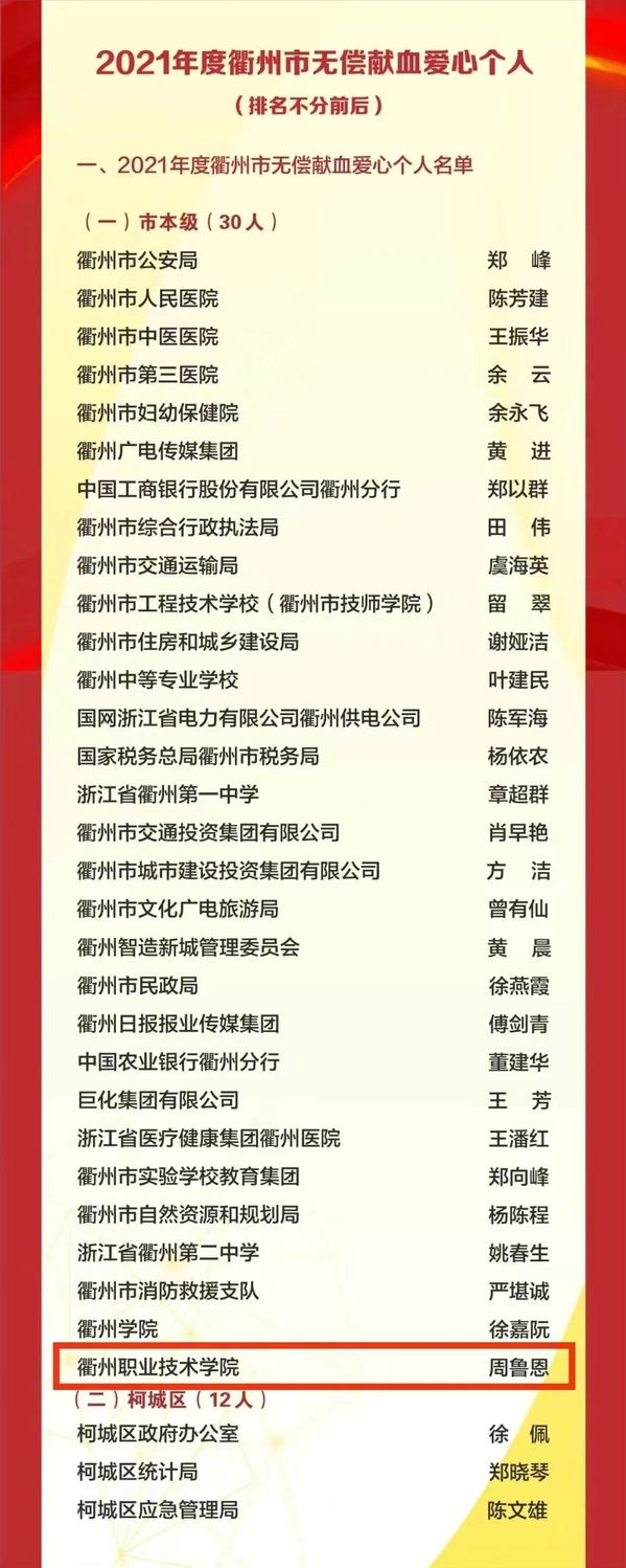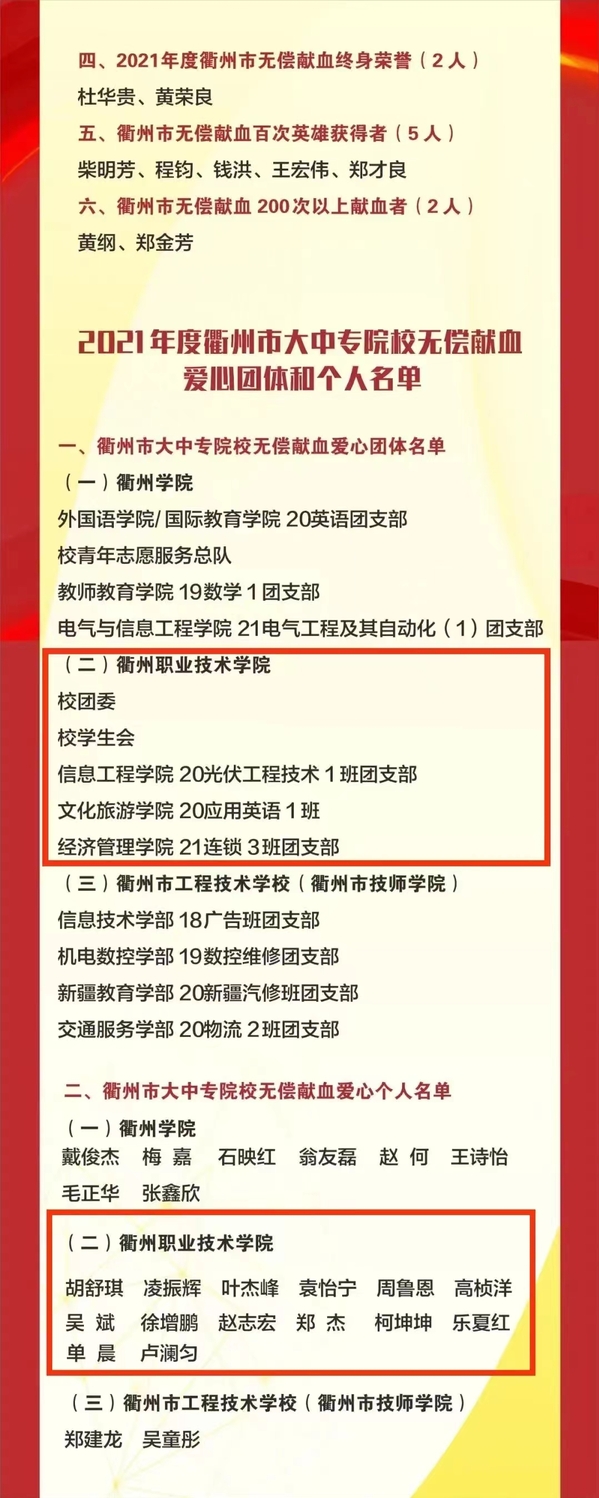 今年6月14日是第19个“世界献血者日”。近日,衢州市中心血站表彰了2021年度衢州市无偿献血爱心单位和个人。其中,我校获得2021年度衢州市无偿献血爱心单位,周鲁恩获得2021年度衢州市无偿献血爱心个人,校团委、校学生会、20光伏工程技术1班团支部、20应用英语1班团支部、21连锁3班团支部获得2021年度衢州市大中专院校无偿献血爱心团体,胡舒琪等14人获得2021年度衢州市大中专院校无偿献血爱心个人。