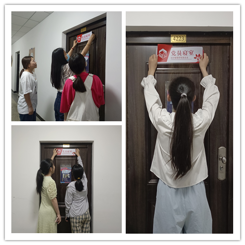 亮党员身份,做先锋表率。学生党员寝室挂牌亮身份,明晰责任,争做标杆,营造“讲政治、讲文明、讲和谐、讲学习、讲卫生”的宿舍氛围,发挥学生党员在日常学习生活中的模范带头作用。