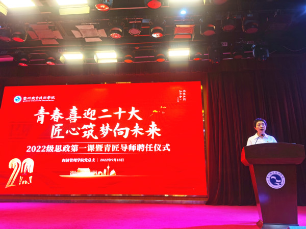 青春喜迎二十大,匠心筑梦向未来。为从源头上强化政治引领,加强对2022级新生在政治上、思想上、组织上的教育引导,并激发其以昂扬的精神状态迎接二十大的召开,经济管理学院在“九一八”事变91周年之际,于9月18日晚在1号报告厅面向2022级新生举行了2022级思政第一课暨青匠导师聘任仪式。经济管理学院党总支书记斯彬彬主持。