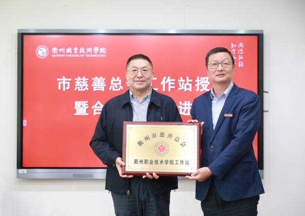 毛建民为衢州市慈善总会衢州职业技术学院工作站授牌,吕延文接牌