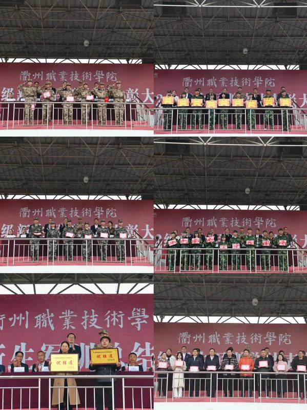 姚水洪宣读2022级学生军训工作优胜集体和先进个人名单,校领导和承训部队领导为2022级学生军训工作优胜集体和先进个人颁奖。徐须实代表学校向驻衢武警支队赠送了锦旗。