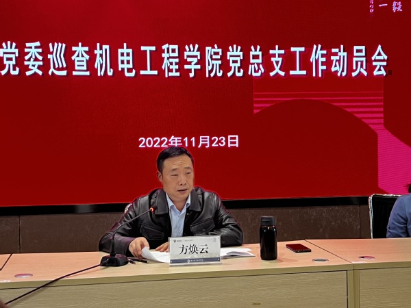 方焕云作巡查工作动员讲话。方焕云指出,党的二十大报告强调,全面从严治党是一项重大的政治工作和政治任务,开展校内巡查是全面从严治党向纵深发展的有效形式。方焕云强调,要理解把握巡查工作的内涵要求,切实支持配合做好巡查工作。一要提高政治站位,充分认识开展校内巡查工作对推动高质量发展、全面从严治党和深化改革创新的重要意义;二要全面贯彻巡查工作方针,把“两个维护”作为根本任务,围绕“立德树人”强化政治监督;三要强化政治担当,增强自觉接受监督的政治意识,机电工程学院要本着对党的事业高度负责的态度,积极支持配合巡查组,共同完成好本次巡查任务。