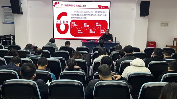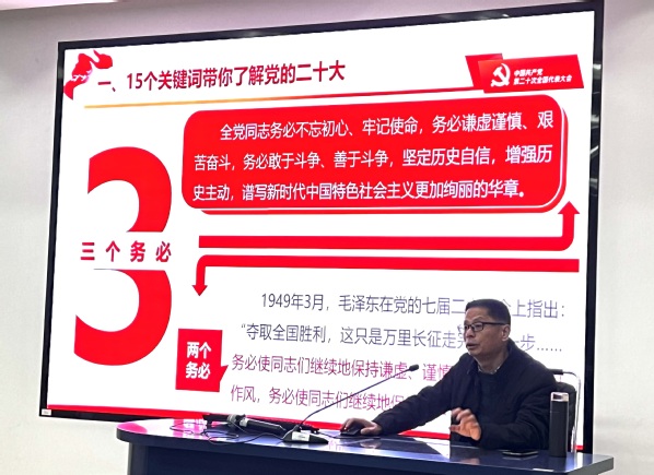 11月30日下午,校党委委员、副校长余建军在图书馆2号报告厅宣讲党的二十大精神,机电工程学院、科研处、后勤保卫处、资产与实训室管理处全体教师参加学习。