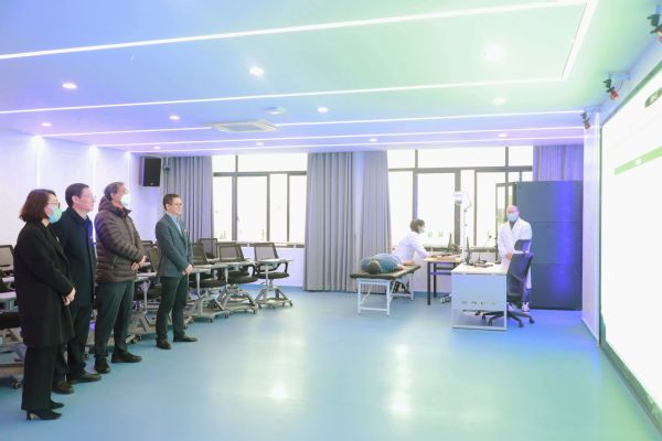 卓同年走访了医护康养实训中心、大健康公共实训中心,实地考察了解剖、中医康复、针法、灸法、针灸智慧、虚拟仿真、现代护理、人体形态、推拿、急诊医学、中医基础等实训室,同上课师生进行了交流。详细了解了医学院相关专业培养目标、课程设置、软硬件投资、师资队伍建设、招生就业等情况。