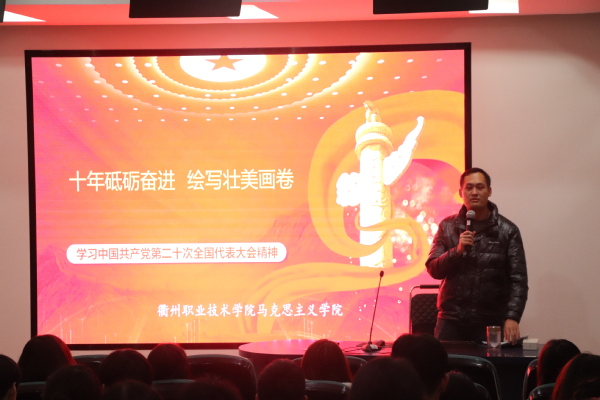 活动中,王刚老师以马克思主义唯物史观导入教学,引出宣讲主题,接着从一段伟大的历史书写、新思想领航新时代、不断实现人民对美好生活的向往、成功推进和拓展中国式现代化、为人类谋进步为世界谋大同、党的自我革命等方面展开党的二十大精神宣讲,让大家深刻感受到了新时代十年中国的非凡成就,形象生动地阐释了新时代十年的伟大变革不是轻轻松松得来的,是在战胜各种风险和挑战甚至是惊涛骇浪中得来的,是全党全国人民团结奋斗、坚决斗争的结果。
