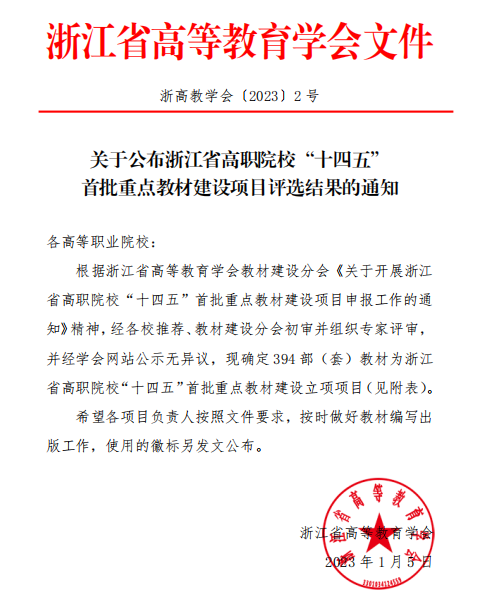 浙江省职业院校“十四五”重点教材建设项目主要立项国家级及省级“双高”专业群建设配套教材、国家级及省级教学创新团队等建设配套教材、国家级及省级精品在线开放课程配套教材等。下一步,项目负责人应根据文件要求,紧密对接科技发展趋势和产业需求,及时吸收行业发展新知识、新技术、新工艺、新方法,高质量完成教材的编写出版工作,切实提高教材建设水平。