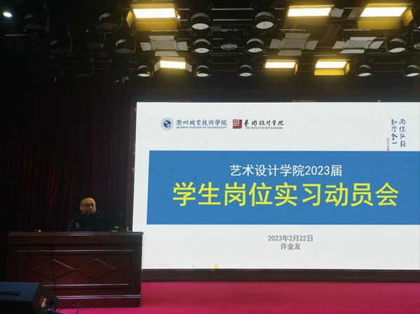 2月22日上午,艺术设计学院在图书馆一号报告厅召开了2023届毕业生岗位实习动员会。党总支书记戚景云、党总支副书记范洪梅、学工办主任王志煊、各工作室老师以及全体2023届学生生参加此次大会。会议由副院长许金友主持。