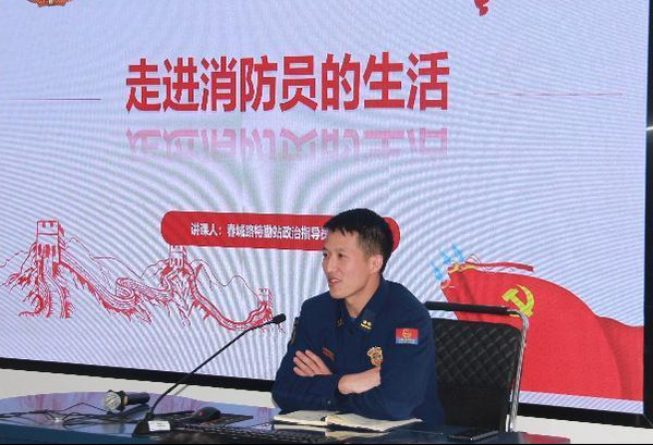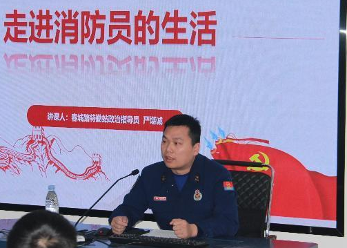 支队春城路特勤站政治指导员严堪诚从衣食住行、文化生活、发展方向三个角度切入,对消防员的训练和生活进行了较为全面的介绍。他以图片及视频的形式生动地展现了消防员职业中的责任与担当,强调对年轻消防员的培养方针是“严管厚爱”,希望同学们在年轻的时候选择热血且可以实现梦想的消防员职业。