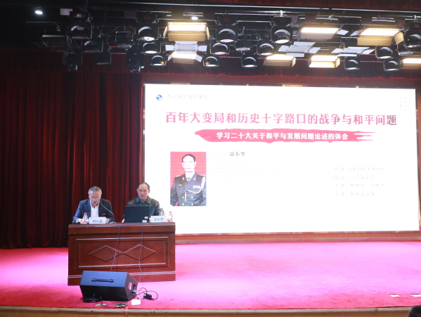 郭小华结合自身多年从军经历和学习党的二十大精神体会,围绕“用历史的眼光看待战争——另眼看世界” “举和平大旗,建人类命运共同体” “中国的国防和军队现代化”等三个方面,紧扣百年未有之大变局的时代主题,结合自身工作经历,对我国国防建设的历史、当前国际形势走向、我国国防现代化建设作了分析与展望,报告观点独到、深入浅出。