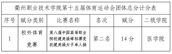 参照《衢州职业技术学院2022-2023体育工作手册》规定,校外体育竞赛将纳入当年体育运动会团体总分。
