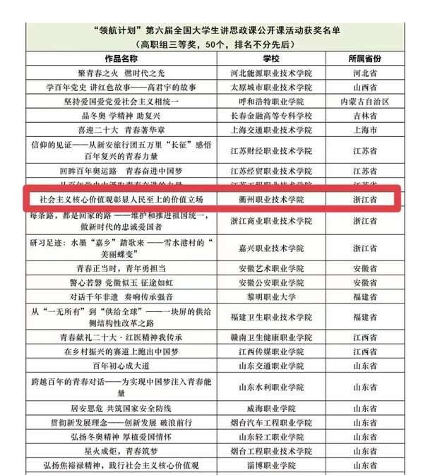 第六届全国高校大学生讲思政课公开课展示活动以“青春献礼二十大•强国有我新征程”为主题,旨在引导大学生深化对思政课教学内容的认识和思考,展现新时代大学生的马克思主义理论素养和精神风貌,深刻理解中国共产党为什么能、马克思主义为什么行、中国特色社会主义为什么好。据悉,大学生讲思政课公开课高职组,全国各地共提交三千多个作品参评,评出一等奖20个、二等奖30个、三等奖50个、优秀奖100个,竞争异常激烈。最终,由马克思主义学院思政教师缪文思、王刚、陈旭雯指导,学生叶敏欣、徐新月、柴骏琪、叶煜媛主讲的作品《社会主义核心价值观彰显人民至上的价值立场》在诸多作品中,突出重围,斩获殊荣!