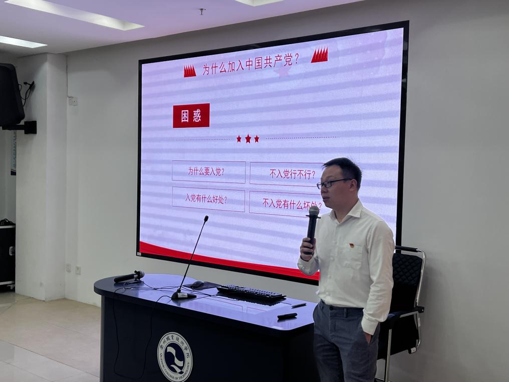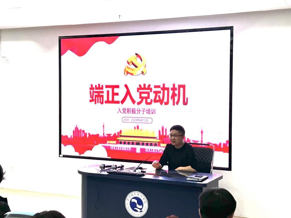 机电工程学院副院长徐文俊结合党的二十大精神讲述了作为大学生入党积极分子如何端正入党动机。徐院长希望入党积极分子们要加强理论学习,提高政治站位;入党要永葆初心,坚定理想信念;加强党性修养,端正入党动机。把青春奋斗融入党和人民事业,成为实现中华民族伟大复兴的先锋力量。