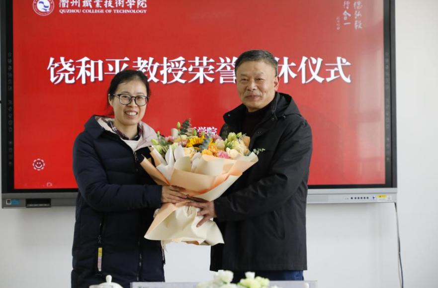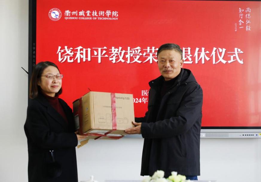 徐须实代表校党委向饶和平同志光荣退休表示热烈祝贺,对饶和平同志多年来为学校发展作出的贡献表示感谢。徐须实说:“饶和平教师就是我心目中高校教师应有的模样”。他高度赞扬了饶教授是老卫校复建的创建者、衢职院医学系的奠基者、衢职院科研和社会服务工作的开拓者,为医学院、衢职院高质量发展,作出了突出贡献。他希望饶和平教授退休不褪色、离职不离情,持续关心支持学校建设发展;医学院要传承弘扬70多年办学传统,锚定“新双高”、职教本科奋斗目标,为学校发展建设增添正能量、再作新贡献。
